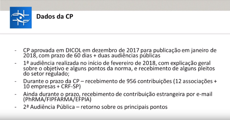 Com isso, as discussões que estão ocorrendo para atualização desta norma são de grande valia para todos os envolvidos, e com o objetivo de oferecer o conteúdo que foi discutido no dia 05 de setembro na ANVISA, disponibilizamos abaixo as imagens dos slides apresentados pelo Senhor Rafael Sanches, em sua apresentação que ocorreu no inicio da audiência pública, vale ressaltar que alguns slides contém informações bem pertinentes e importantes sobre o tema.