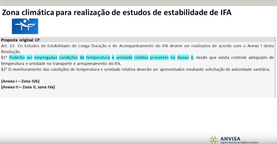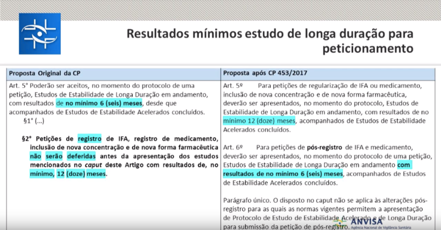 Está em discussão na Anvisa por meio de consulta pública nº 453/17, que dispõe sobre a estabilidade de IFAs e medicamentos. O debate está em aberto e ocorreu, audiência pública presencial no dia 5 de setembro em Brasília, na ANVISA.